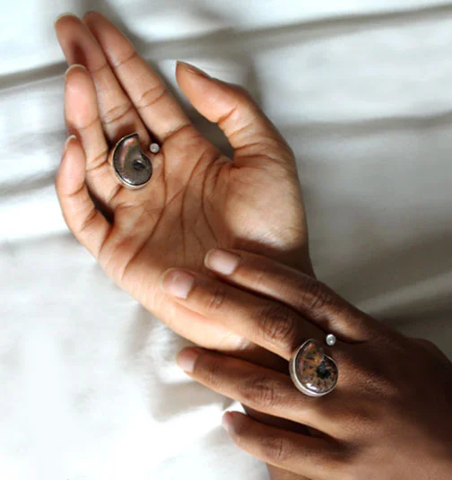 Evolution features ammonite, a crustacean that lived between 64-400 million years ago depending on the species. Despite total extinction, these shell-like fossils experience a new life as modern mementos. Ammonites feature a subtle yet beautiful iridescence and are unrelenting in their quest for permanence. They are the ultimate representation of the persistence of time and its ever-changing effects on nature.
